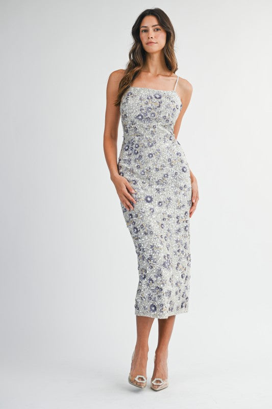 Step into festive fun with the Merry & Bright Dress—a dazzling 3D floral sequin bodycon midi that hugs your curves in all the right places. Adjustable spaghetti straps ensure the perfect fit, while the back invisible zipper and slit add a flirty touch. Fully lined for comfort, this dress is your go-to for turning heads and shining bright at any celebration.