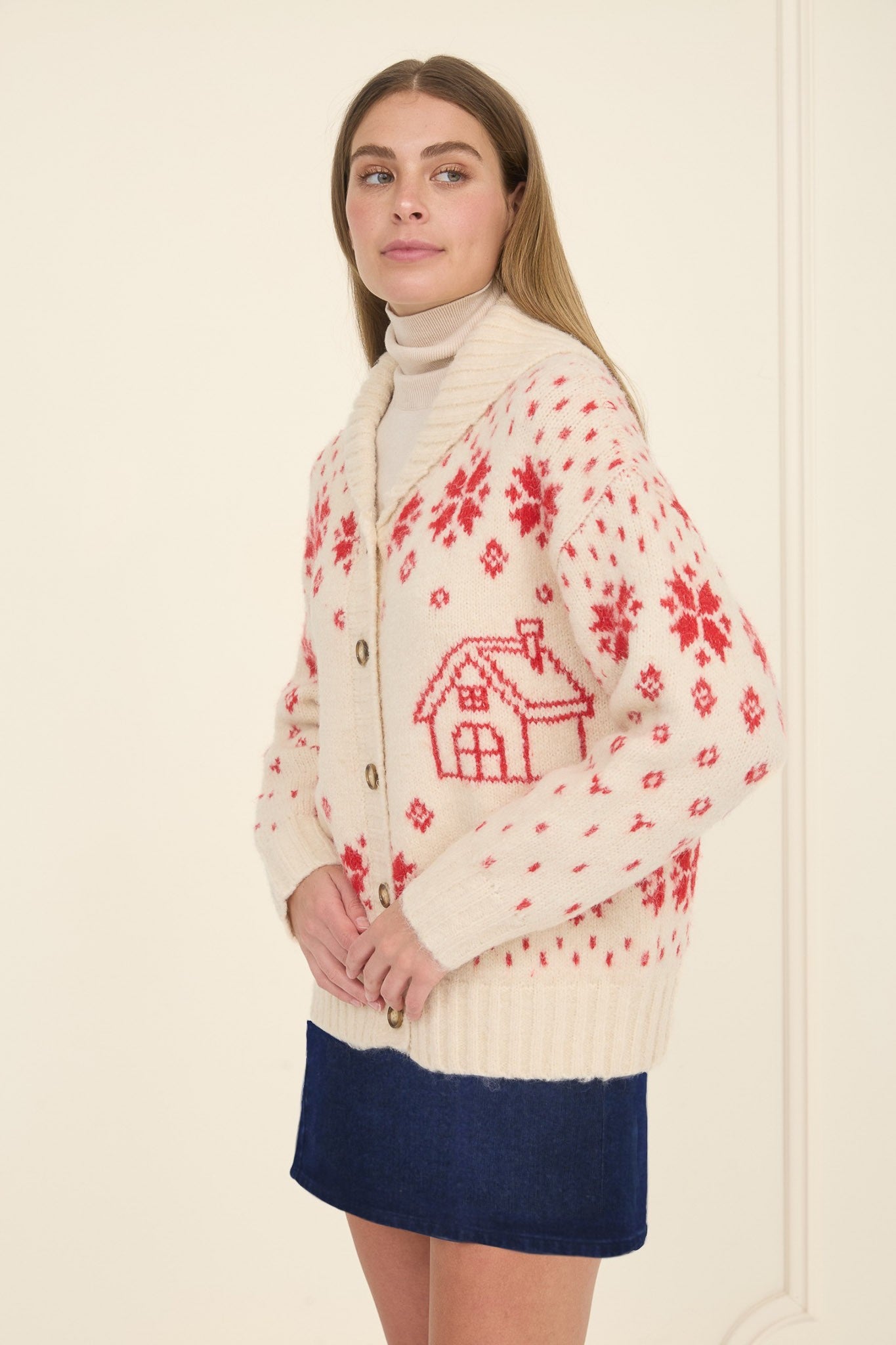 Wrap yourself in cozy charm with the Iris Cardigan, a delightfully playful knit that brings winter warmth to your wardrobe. This wool blend beauty features a flattering V neckline with an elegant shawl collar, paired with long drop-shoulder sleeves for effortless style. Button down the front for easy layering, and admire the charming snowflake cabin jacquard pattern that dances across the fabric. Unlined for a lighter feel, this knit sweater is your new go-to for casual elegance and snug comfort.