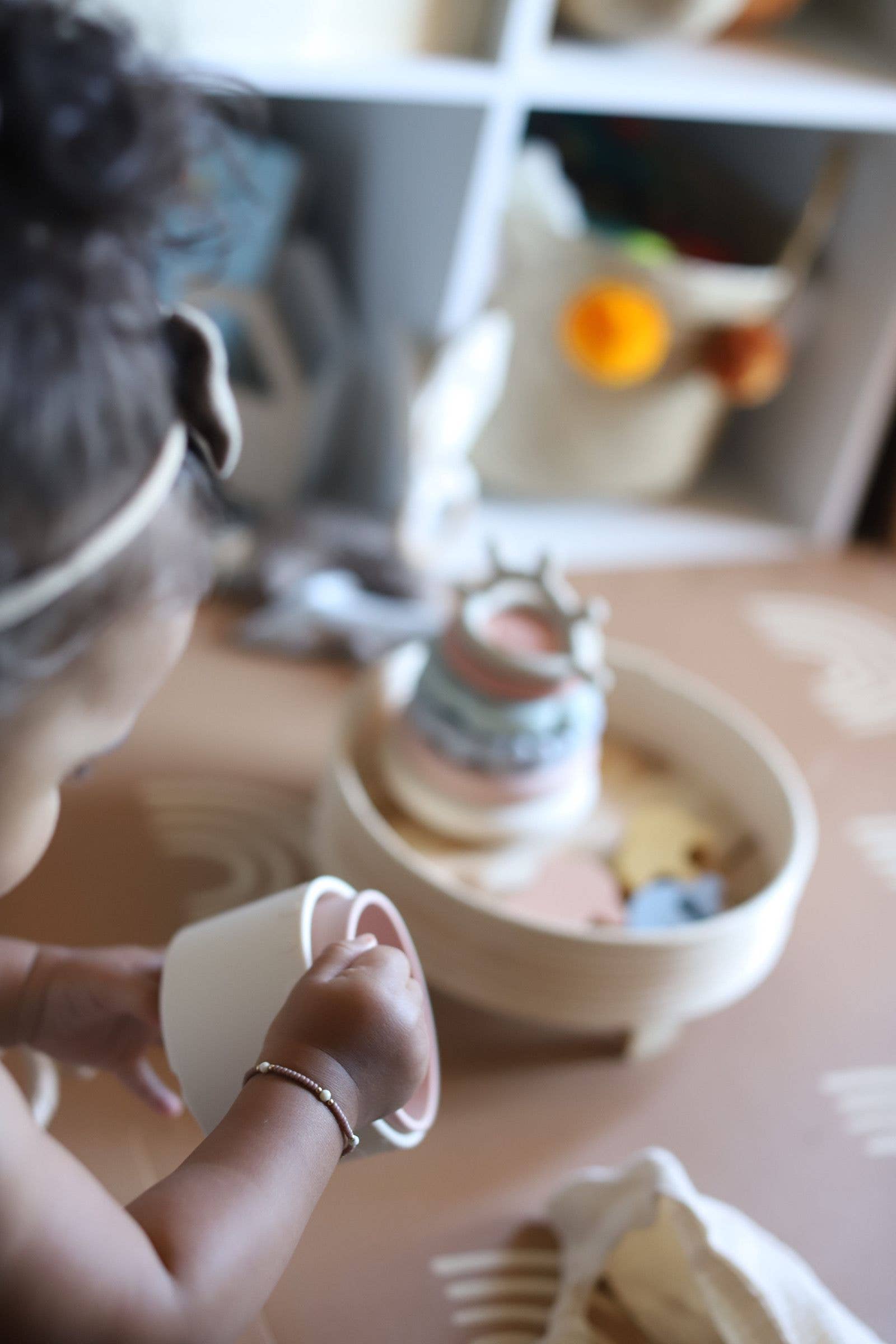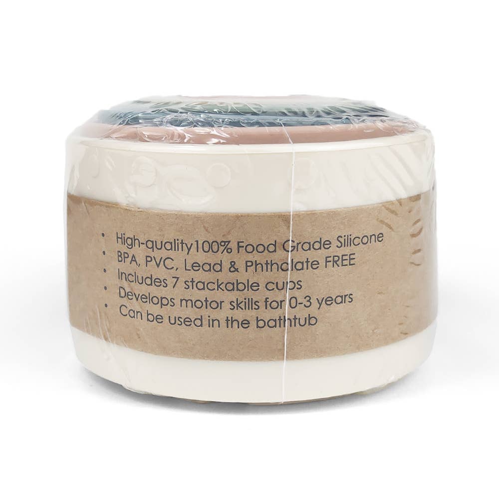 Our large silicone Stacking Cups are the perfect multifunctional toy for your baby's development. The cups encourage fine motor skills, coordination, and recognition of colors and size. Each set includes 7 soft silicone cups with shapes cut into the bottom which makes them a fun toy to use in the bath, beach, or just in a playroom. Made from 100% grade silicone. Free from BPA, PVC, latex & phthalates. Cute details, Stackable and durable Dishwasher Safe. Wash with warm soapy water before use Shapes: Rainbow, Cup Cake, Unicorn, Dinosaur, Cactus, Cherry, Flower. Size: 28.3 cm when stacked tall, 9 cm when stacked into each other. Suitable for age +3 months - please inspect for any possible damage prior to each use and discard if damaged.